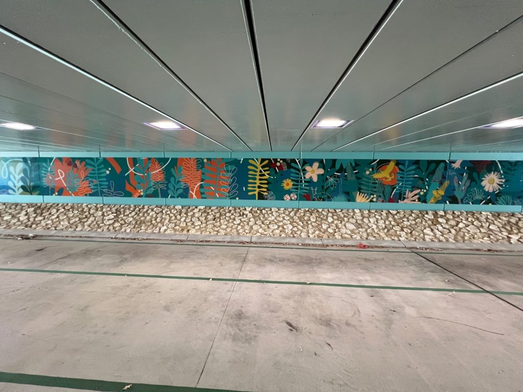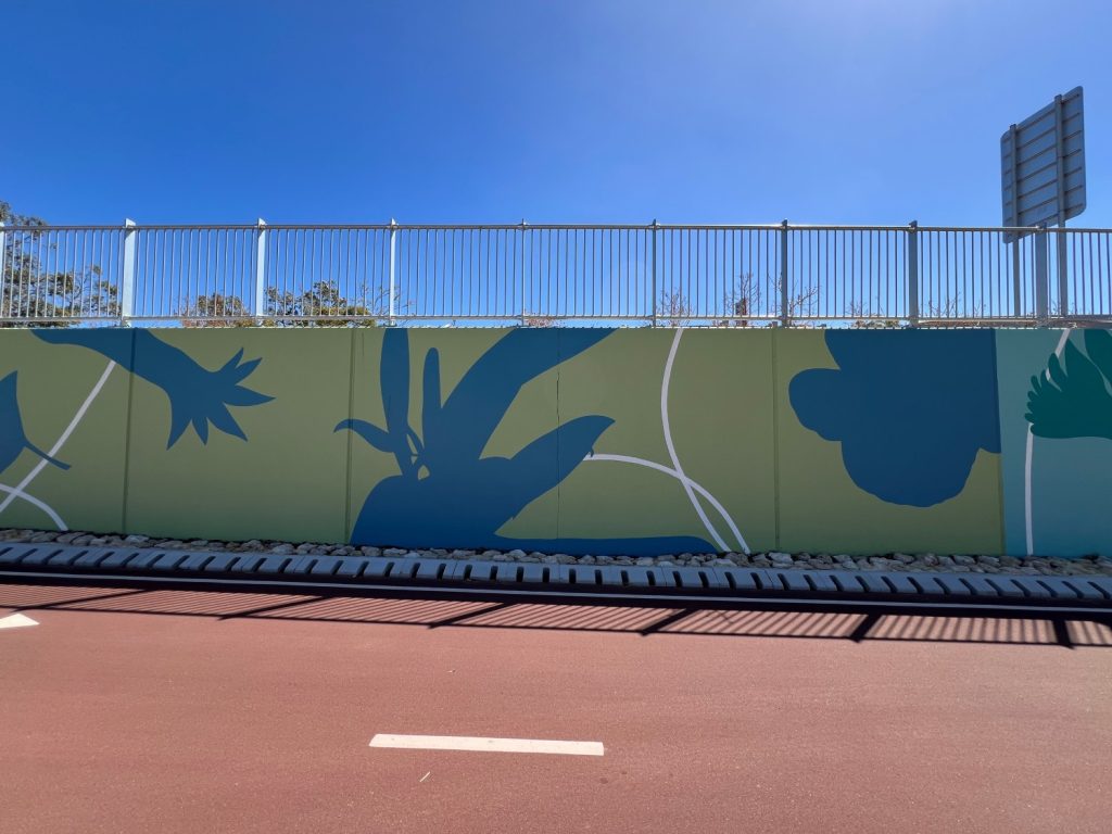 Spanning more than 700m² of surface area, Kwobidok Wilderness transforms the Karrinyup Underpass into an expansive, immersive celebration of local bushland. The work includes both painted and a digitally applied mural section, with a highly detailed central tunnel area trialled as a test case for future public infrastructure art treatments.