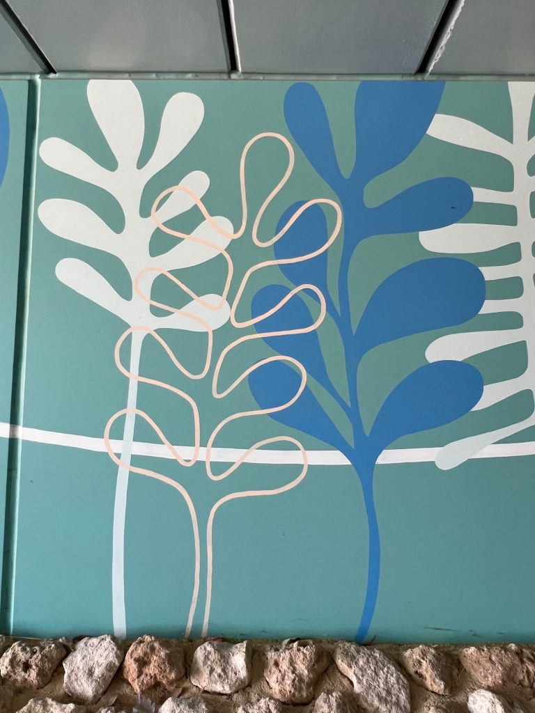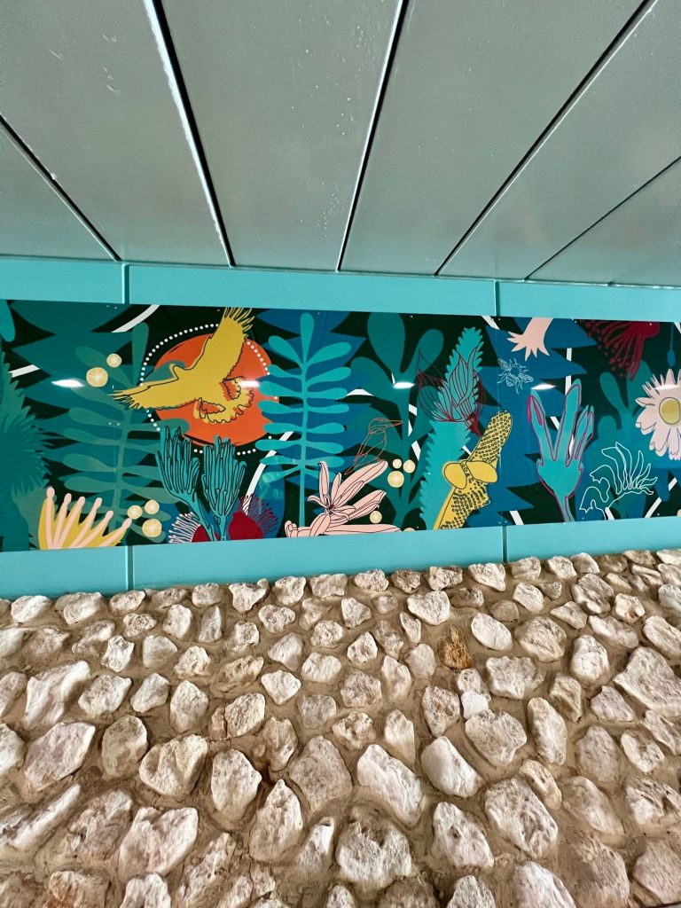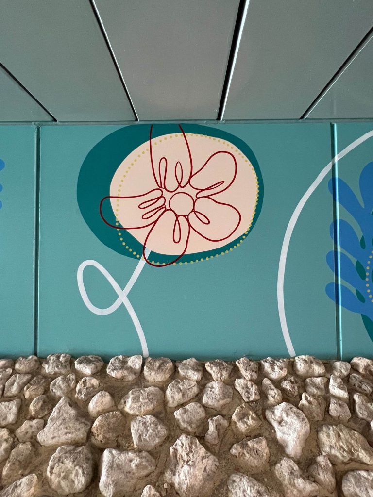 A dynamic ‘energy line’ weaves through the mural, symbolising vitality, growth and the interconnected journey of life. This recurring graphic motif appears across my broader practice, anchoring the artwork in my visual language while resonating with the rhythms of nature.