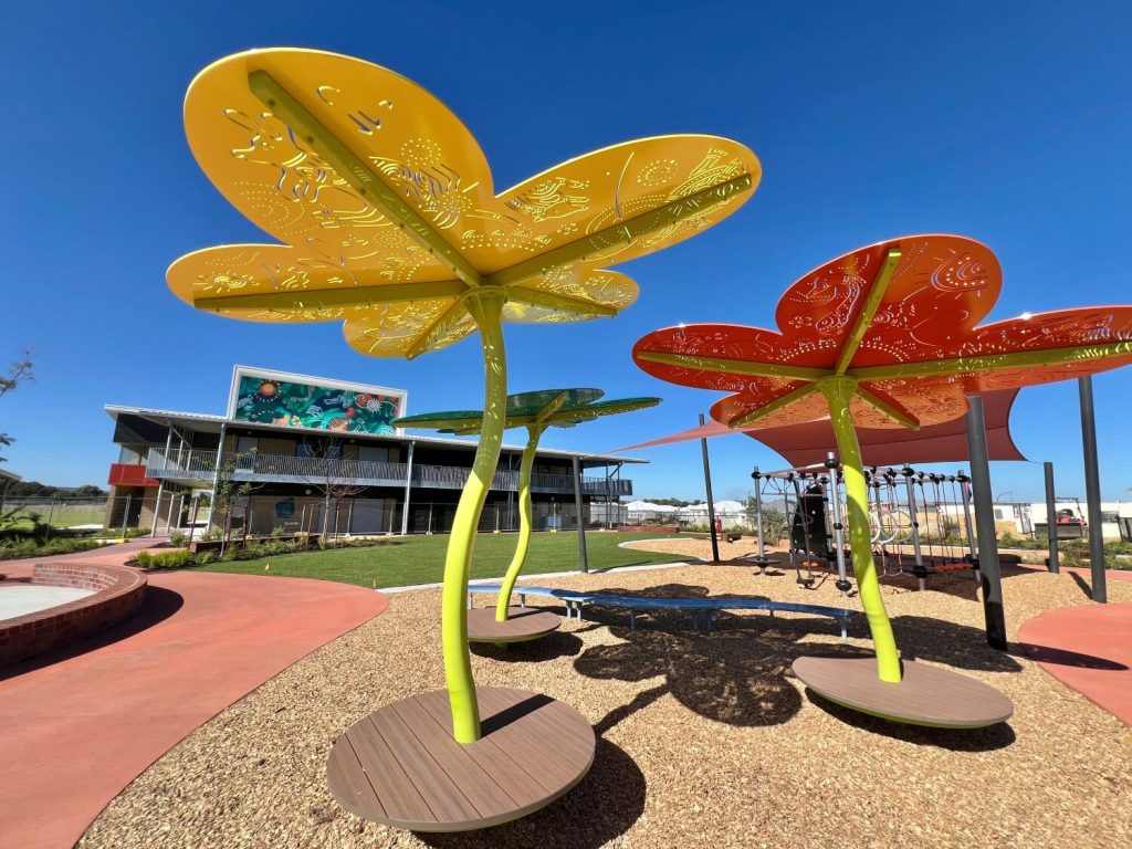 • A cluster of colourful native flower sculptures creates a joyful intervention near the school’s circular seating areas, forming a contemporary ‘mandjoogoordap’ (meeting place). These works encourage interaction and connection – anchoring students in a story of community, environment and personal growth.