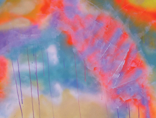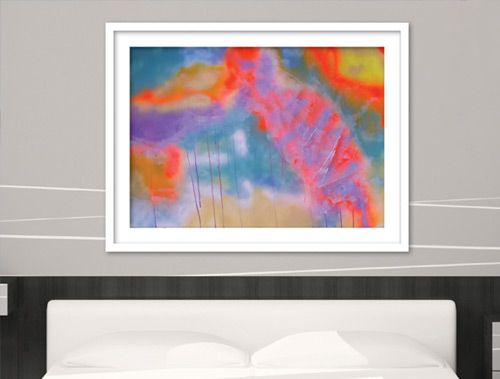 Acrylic and aerosol on paper. The mix of bright and muted tones with aerosol captures a dreamscape piece you can look at and escape reality.