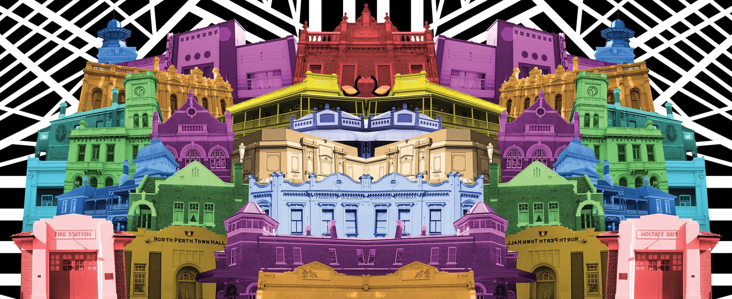 This digital montage from the Chronicle series celebrates the stunning heritage architecture of Perth. Bright lights, showbiz-esque celebrating our colourful city with buildings from North Perth, Guildford, Leederville, Mount Lawley, Bassendean and Perth. The pair of graceful swans watches over the town.